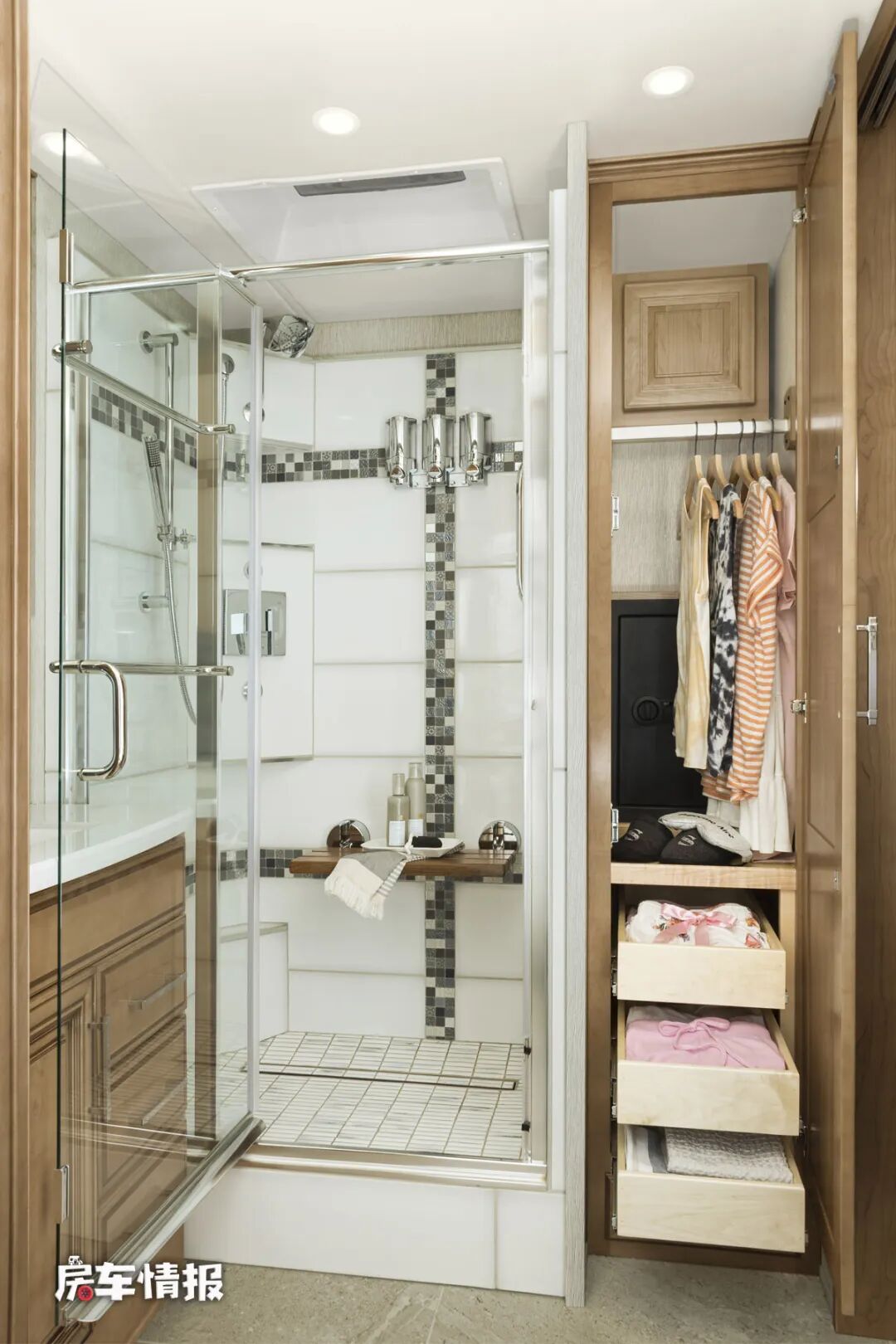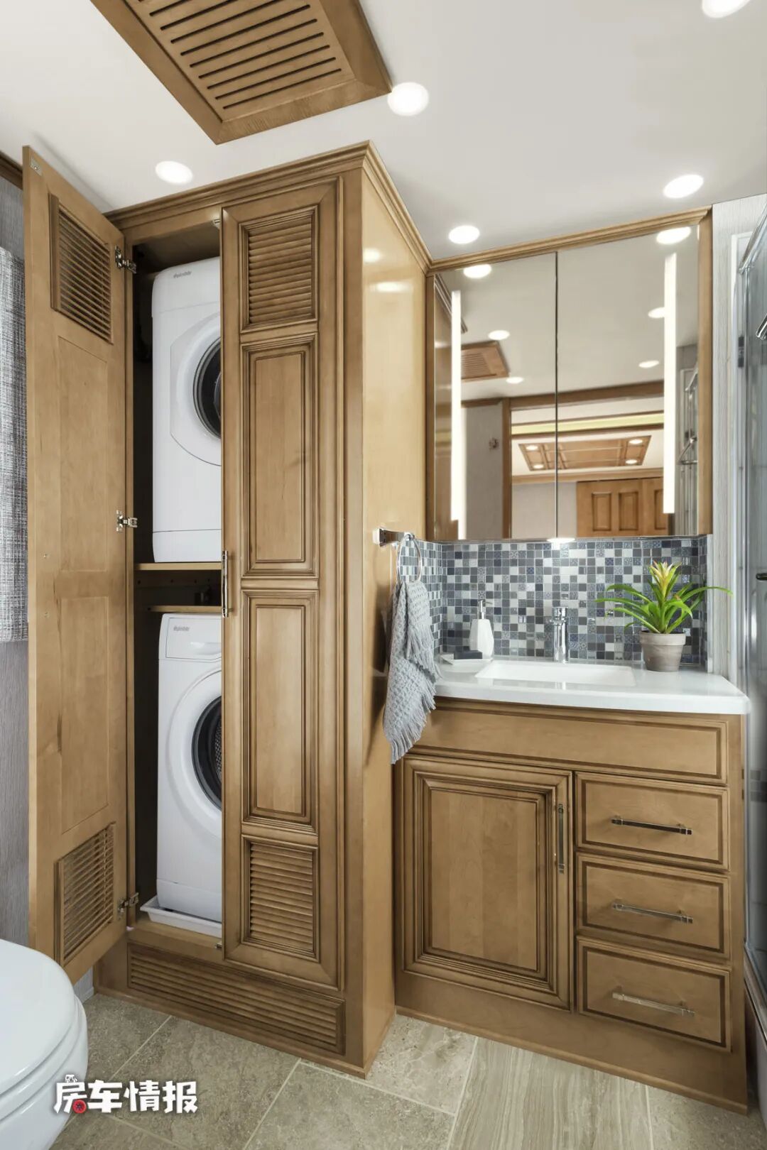 休息区内侧是全车的第二个卫浴区,相比客厅处的卫生间,这个卫浴室更加私密,空间更加的宽敞,采用干湿分离的设计,最内侧是独立的淋浴间和大衣柜,中间是盥洗台,旁边的柜子里是一台洗衣机和一台烘干机,最外侧则是卫生间,可以说是要多豪华有多豪华。