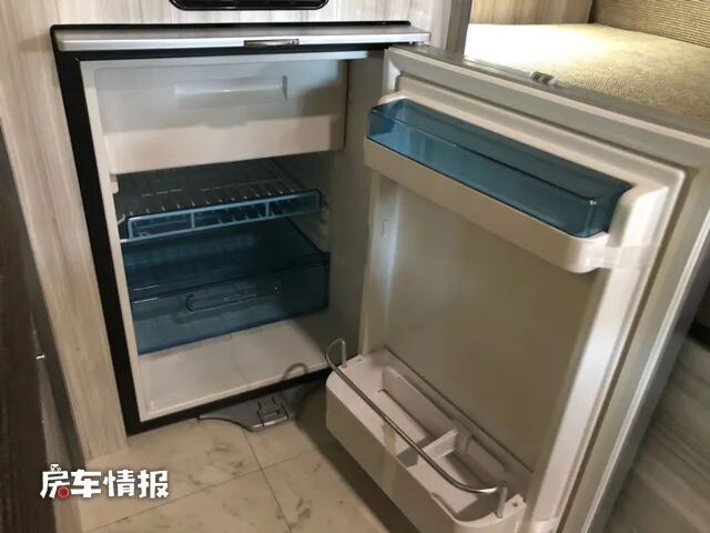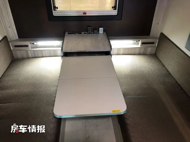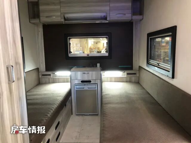 整辆车的后方是设计的最有意思的地方,特别像我们住酒店的标间,是一左一右两张单人床,床头之间还有一个床头柜的设计,下方则提供了一台小型的车载冰箱,顶部还有一台隐藏的家用变频空调,整体是三面环窗的设计,所以感觉不是特别压抑,床头处还配置了小夜灯,晚上使用也非常的方便。