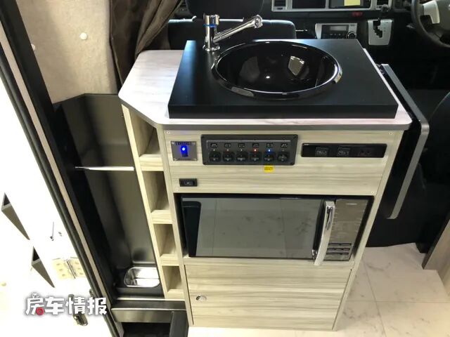 一进乘客门处,就是全车的一个小型的操作台,和我们平时所见的鞋柜设计不太一样,台面上带有基础的水槽,下方依次是控制开关、电磁炉和储物空间,操作台侧面还有一个翻折的桌板可以用来放置卡式炉或者备菜。
