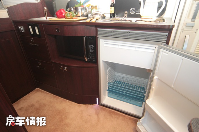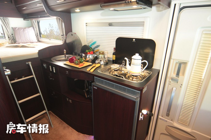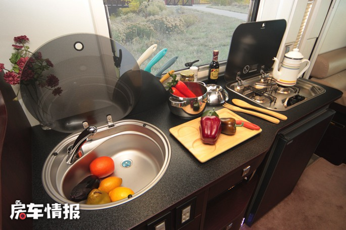 车厢中部则是厨卫所在的区域,车内厨房提供了90L 12V房车专用冰箱、洗菜池、燃气灶等常用设备,便于在旅行中制作美食。