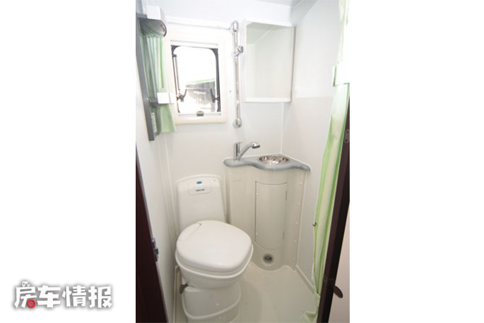 卫生间同样位于车厢中部, 不同于以往见到的日系房车里的简陋,这款车的卫生间提供了齐全的洗漱设施,盒式马桶、洗手池、淋浴、梳妆镜等一应俱全,是一个真正的卫生间!
