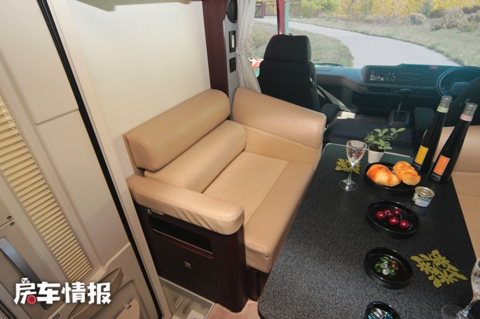 前方区域是客厅休息区,一组超大尺寸的条形沙发可以提供4-5人乘坐,另一侧还提供了一个单人沙发,看起来舒适性就相当不错,夜晚休息的时候,还可以把餐桌降低,把这里拼成一张双人床。