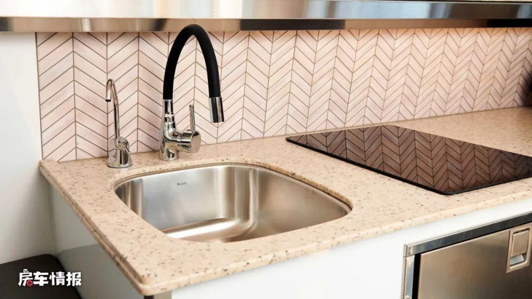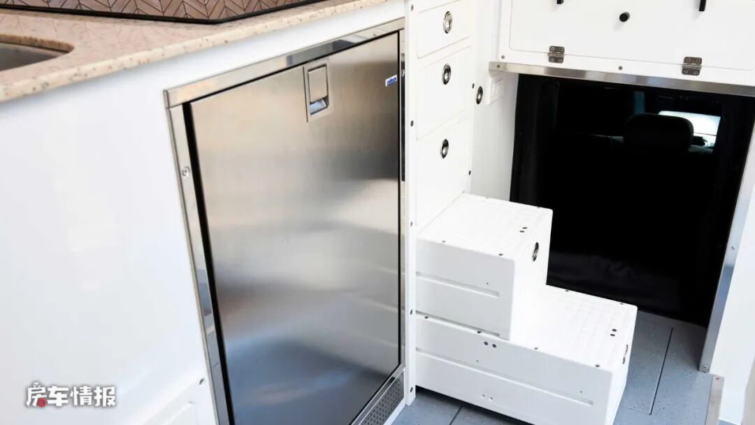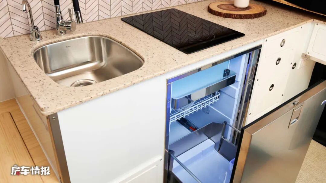 正对乘客门的则是全车的厨房操作台,台面的尺寸还是非常可观的,提供了不锈钢水槽和电磁炉,旁边还留有可以备菜的区域,下方则提供了一台抽拉式的车载冰箱,也能够存放一些简单的食材。