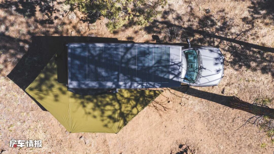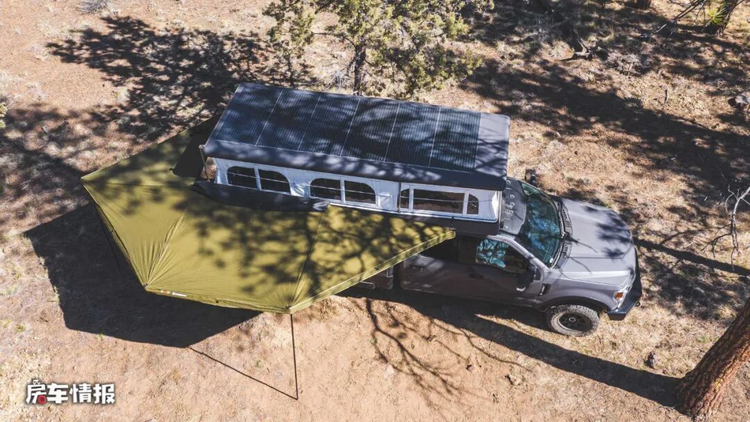 全车以碳灰色为外观,车外所配的遮阳棚也和我们常见的完全不同,打开之后主要集中在车身右侧后部,为不规则状,同时下方也加入了一些简单的户外配件,可以满足日常的需求。