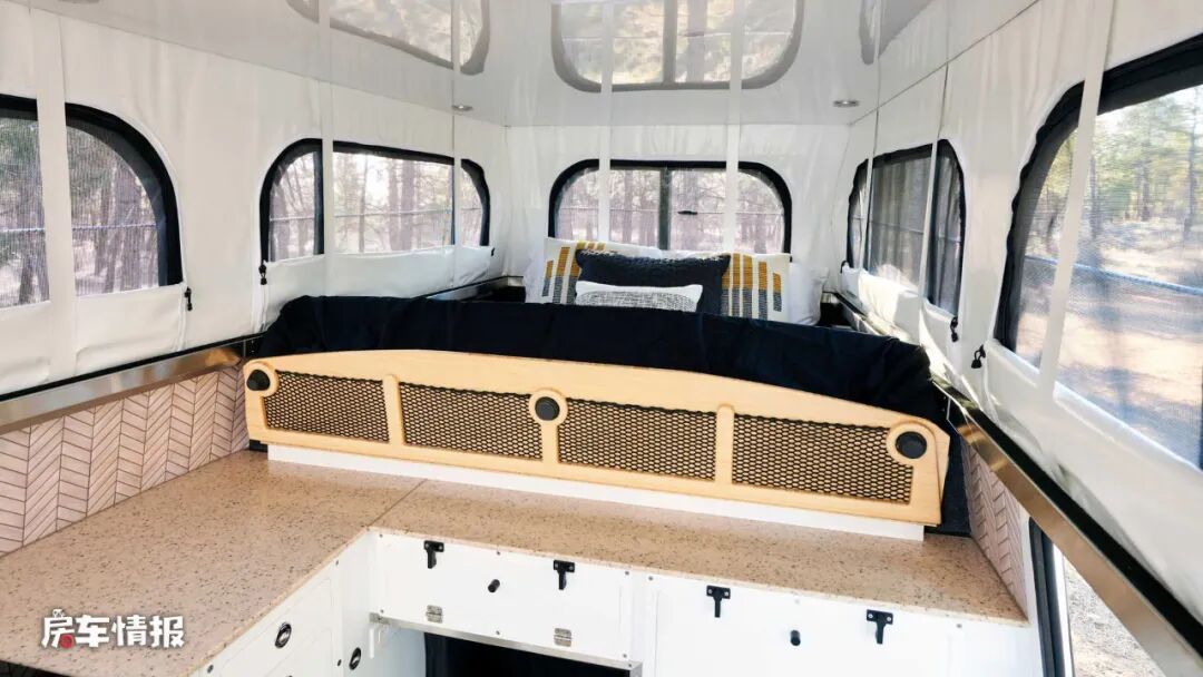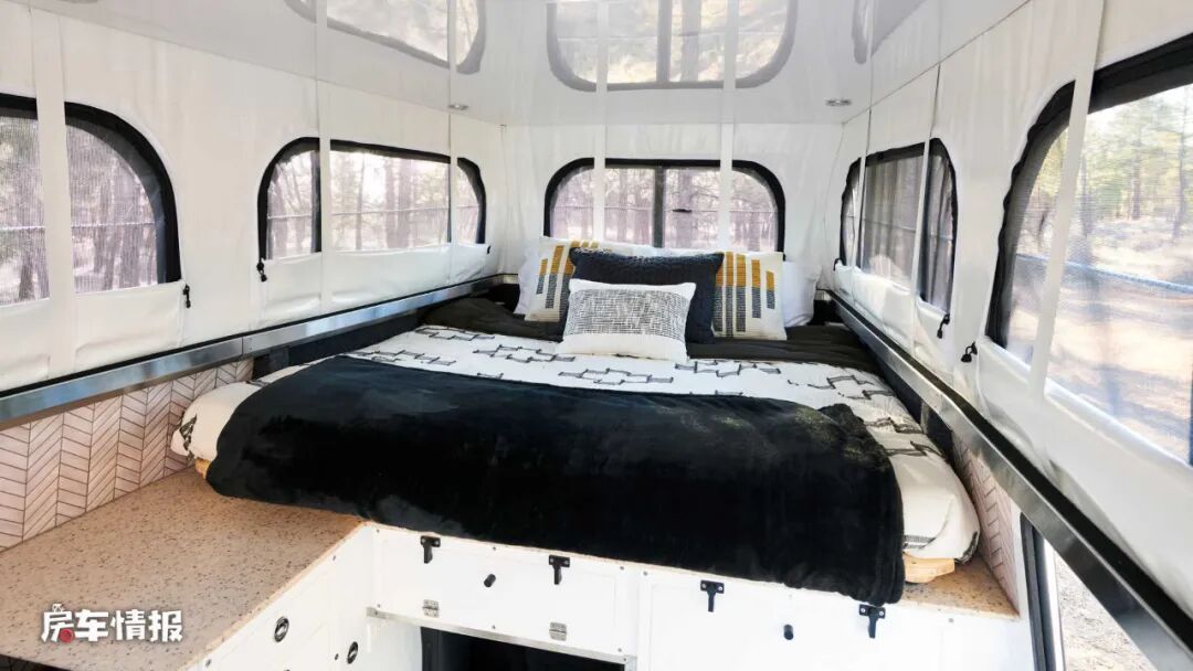 最前方驾驶室顶部,在打开升顶之后就像额头区一样,提供了一张双人的大床,可以满足日常的睡卧需求,另外周围一圈的观赏窗也带来了不一样的视觉感受。