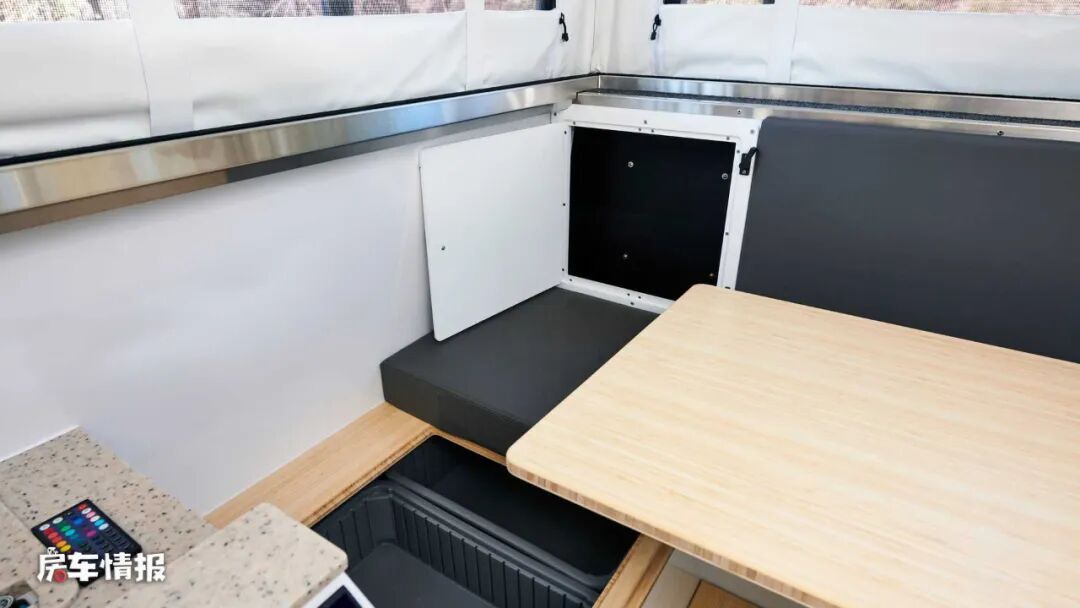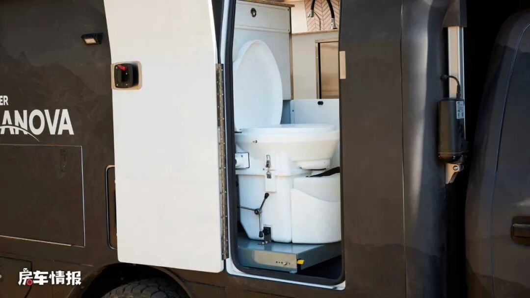 整辆车虽然没有设计一间单独的卫浴室,但是在门口处也隐藏了一台抽拉式的盒式马桶,一些生活的基本需求还是能够解决的。