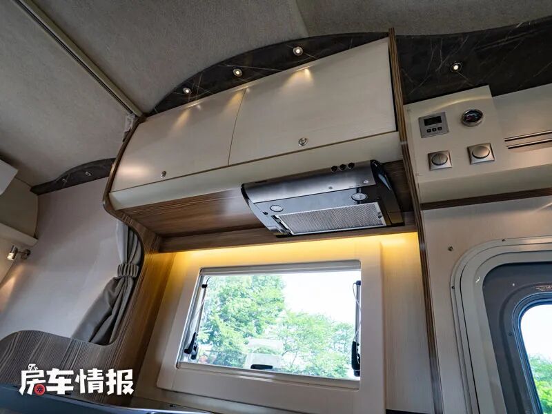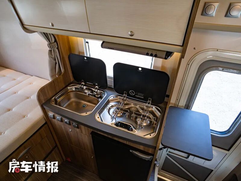 乘客门后方则是全车的厨房操作台,台面的尺寸还不错,提供了翻盖的不锈钢水槽和双孔燃气灶,顶部还配置了抽油烟机,下方则嵌入了一台85L的车载冰箱,侧面还有能够用来备菜的拓展桌板,以满足日常的烹饪需求。
