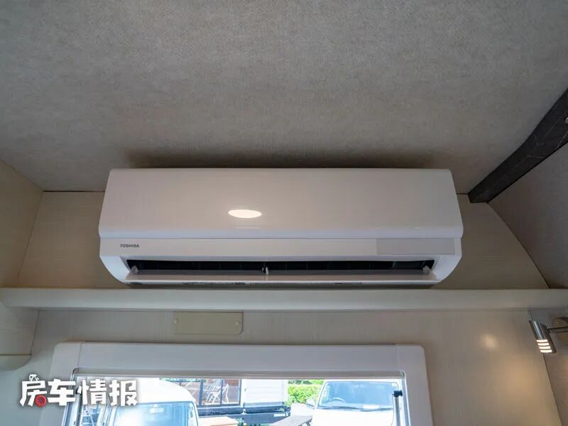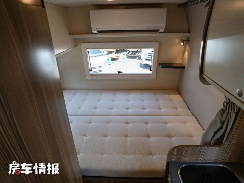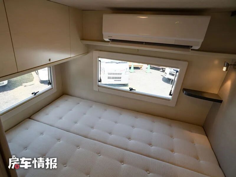 最后就是位于车厢尾部的休息区了,得益于前方的布局设计,整张床的尺寸还是非常可观的,为1900*1400mm,完全可以躺下两个成年人,顶部还配置了一台家用变频空调。