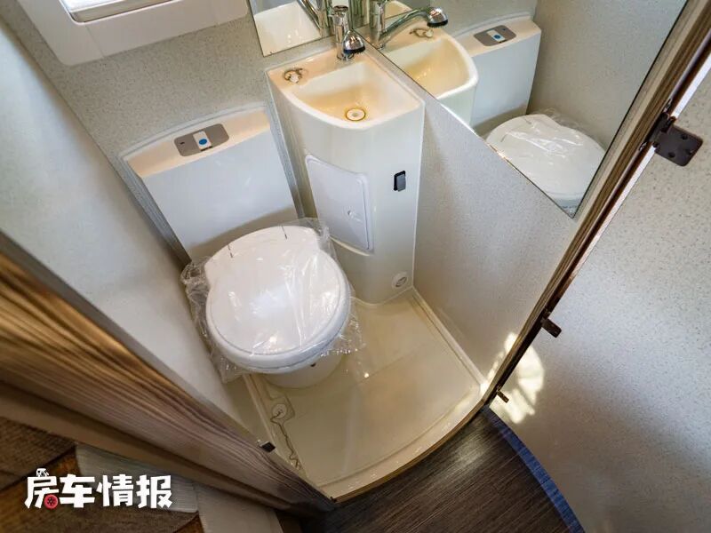 在厨房区的对面,是一间独立的卫浴室,虽然这在国内房车内部很常见,但在日本房车内可以算上是“奢侈”的配置,不过由于前方错位设计的会客区,为整辆车预留出了足够的空间来隔出一间卫浴室,内部还提供了比较齐全的设施,包括马桶、洗手台盆、淋浴花洒、梳妆镜等。