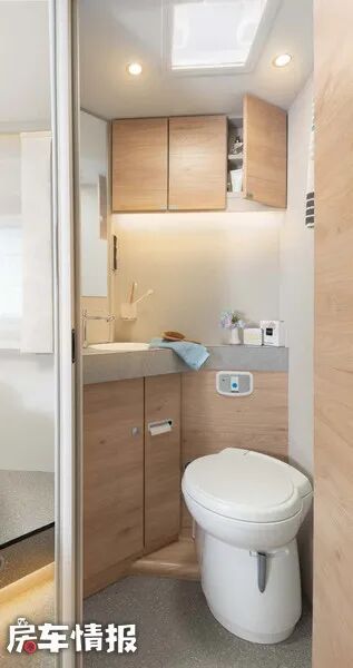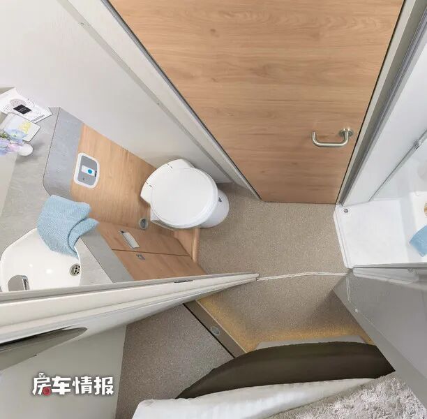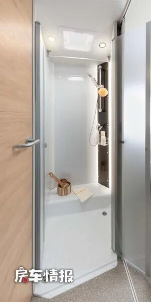 根据车型布局的不同,车内的卫浴室所在的位置也不同,但全部都是采用了干湿分离的设计,外侧是带有马桶、梳妆镜、盥洗台的卫生间,内部则是配有淋浴花洒的淋浴间,不仅空间比较宽敞,而且使用起来更加的灵活便利。
