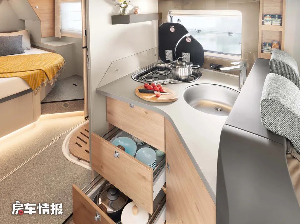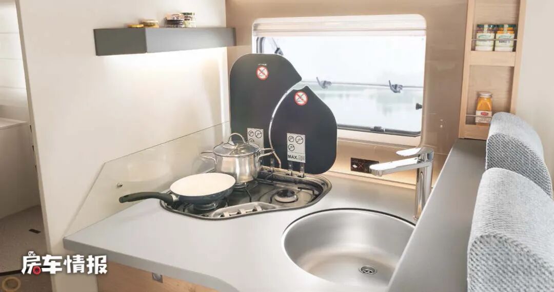 采用对卡座沙发布局的DBL和EBL两款车型的厨房操作台尺寸会相对大一些,而L型沙发布局的DBM和EB车型中的厨房区相对会紧凑一些,不过无论大小,厨房区都配置了相对齐全的用具,包括不锈钢水槽、三孔燃气灶、142L冰箱以及储物空间,可以满足日常基本的烹饪需求。