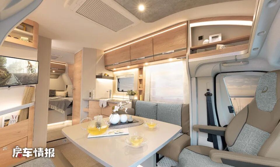 驾驶室后方是全车的会客区域,其中DBL和EBL两款车型是采用了一左一右两张长条沙发+餐桌的设计布局,沙发是使用了棉麻皮艺拼接的包覆,所以整体的亲肤性还是不错的,中间的餐桌也可以移开或者拆卸下来,这样可以使前方的区域更加的宽敞。而另外两款车型DBM和EB则是采用了L型沙发座椅+餐桌的设计,后期无论哪种布局的会客区都可以拼接成一张双人的沙发床,用来休息和睡觉。