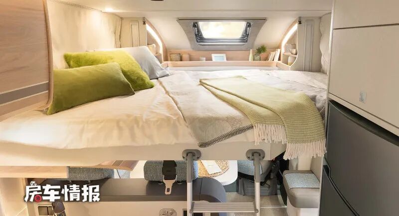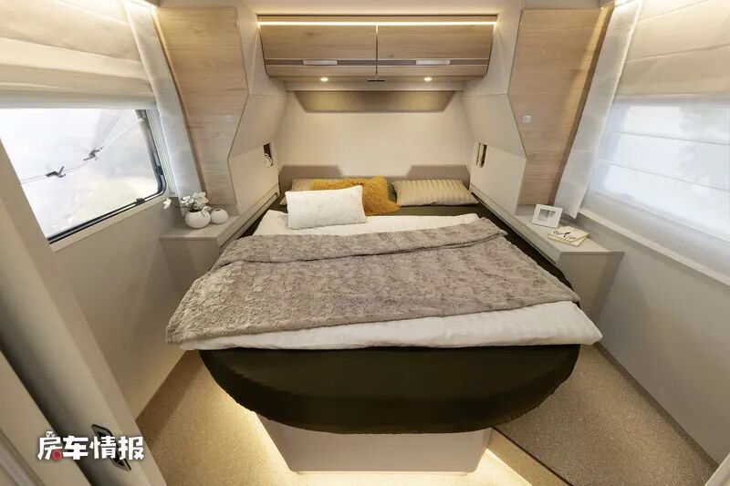 最后就是位于车厢尾部的休息区,其中DBM和DBL车型采用的是双人大床的设计,床铺的宽度可以达到1.6米,足以躺下两个成年人。