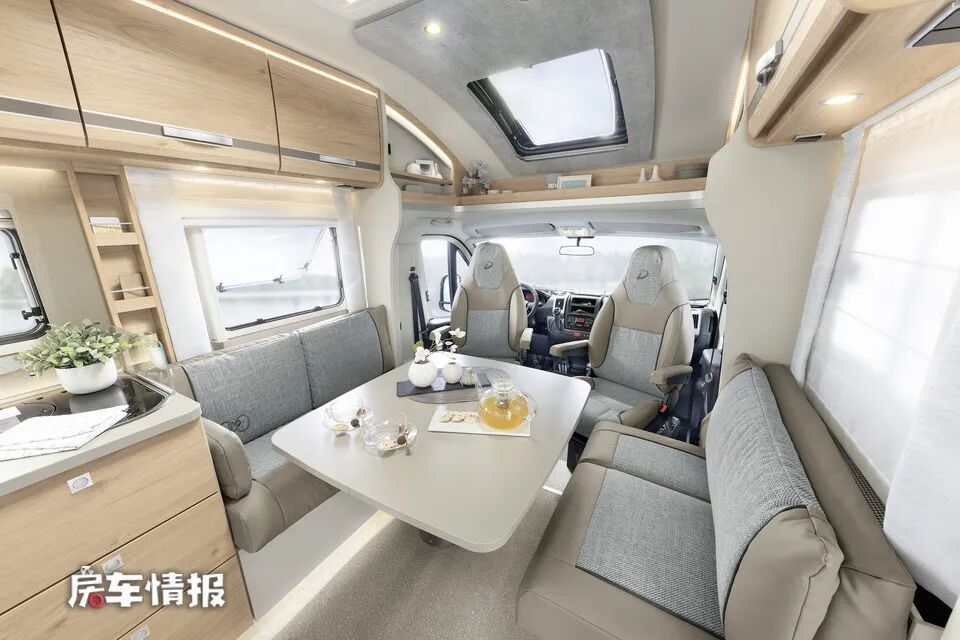 这是一款搭载菲亚特Ducato底盘打造的小顶C型房车,整辆车的外观是采用了空气动力学的造型设计,流线型的额头不仅能够有效的降低风阻,还增加了全车的灵动性,提升了整体的颜值和美感。车身尺寸方面,四种布局的车型都是相同的尺寸,长宽高分别为7410*2330*3000mm,超过7米的车身长度可以为车内带来一个宽敞的生活区。