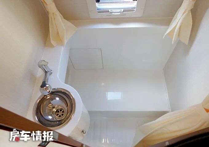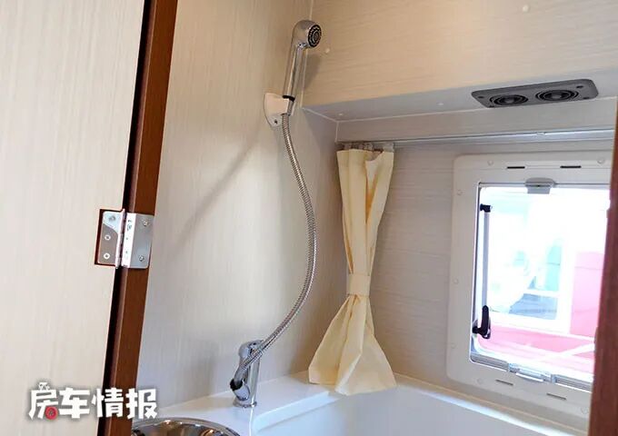 接下来我们在看一下卫生间,卫生间内部空间不大,没有配备固定式的马桶,可以说更像一个淋浴间带有一个小型的洗手盆,水龙头可以抽出,作为淋浴喷头使用,车内配有一台热水器以供使用。