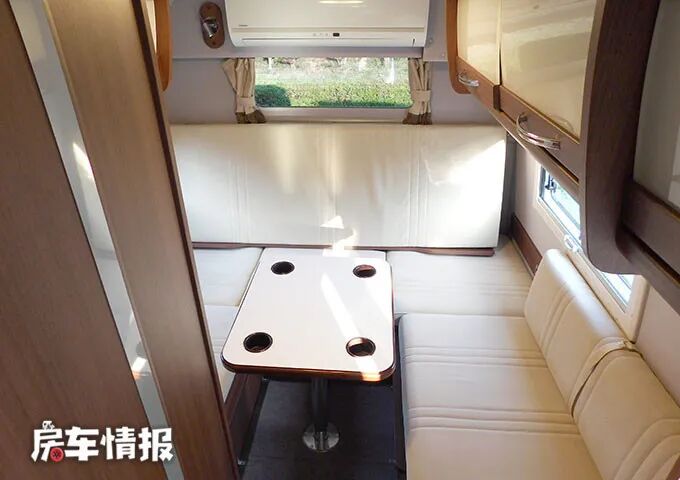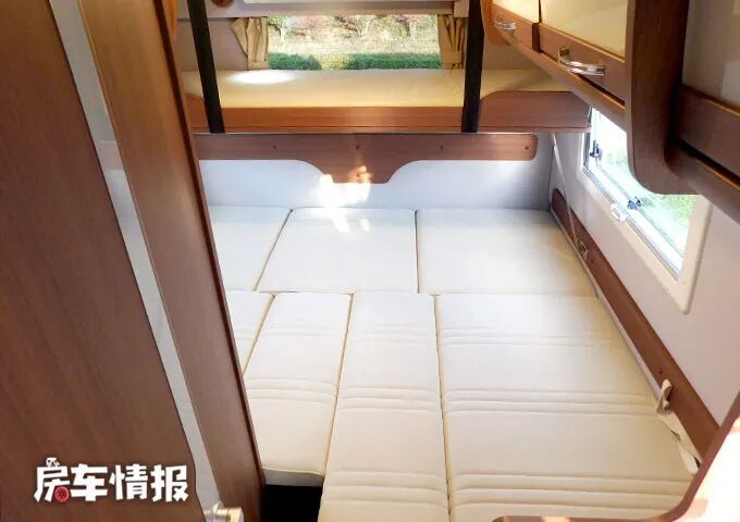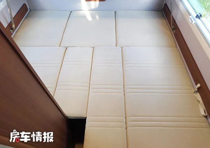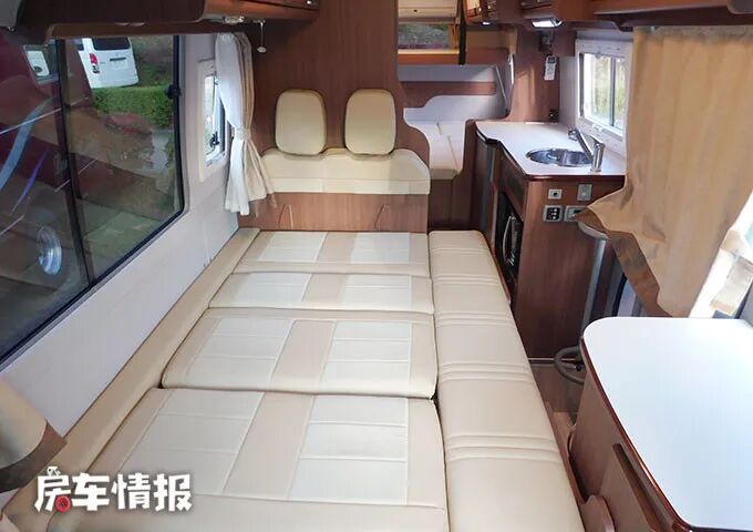 接下来我们看看车尾的主卧区,在行驶过程中可以说是一个环形沙发座椅,可以乘坐3个人(这点与国内房车不同,目前国内房车通常核载4-6人,没有这种9座的车型)。