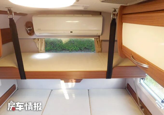 在沙发床的上方还隐藏有一张升降床,这样的话车内就可以满足更多人的使用需求。不过升降床紧挨着空调,夏天的时候舒适度估计不会太好,仅供应急使用还是可以的。
