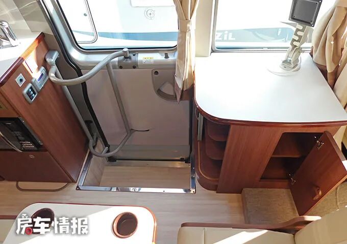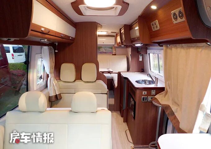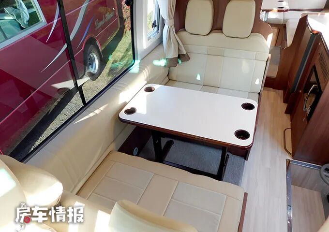 接下来我们到车辆的内部来看一下,车内看起来还是非常居家的,带有会客区、厨房区、独立卫生间,车尾卧室区等主要功能区域。