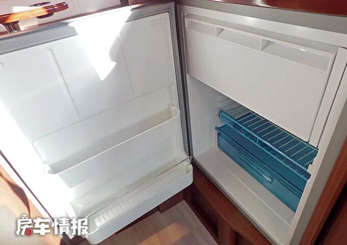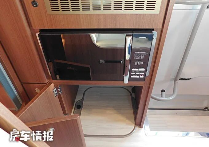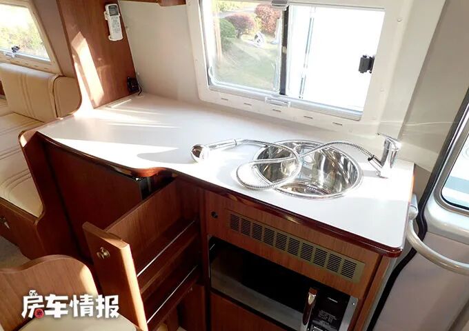 车门另一侧是车内的整体式厨房,配备比较齐全有洗手池、微波炉、储物抽屉、冰箱等常用功能设施满足日常使用需求,同时可以在操作台上放置电磁炉电饭煲等使用。