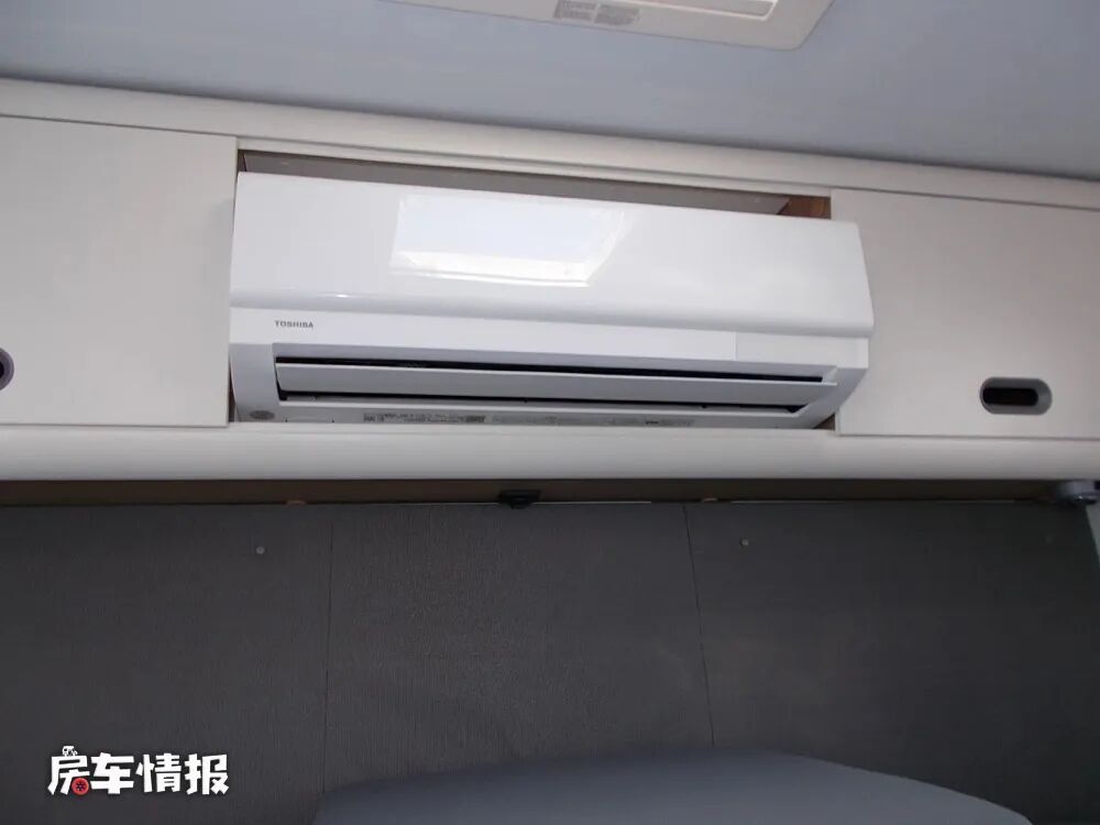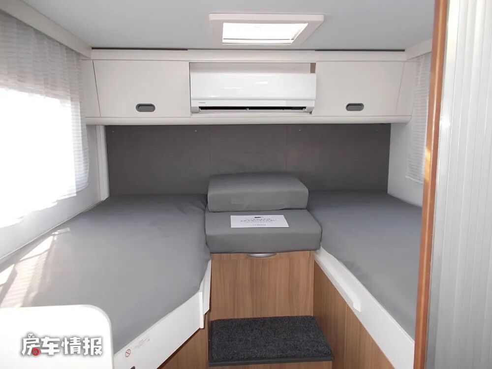 最后就是位于车厢尾部的休息区,采用了和酒店标间一样的设计,一左一右两张单人床,中间的床头柜既可以储物,晚上还可以拓展打开将两张单人床变为一张大尺寸的双人床,除此之外在顶部还嵌入了一台家用变频空调,以保证内部生活区的温度和环境,顶部也提供了一个小型的天窗,使整体的空间感不会显得那么压抑。