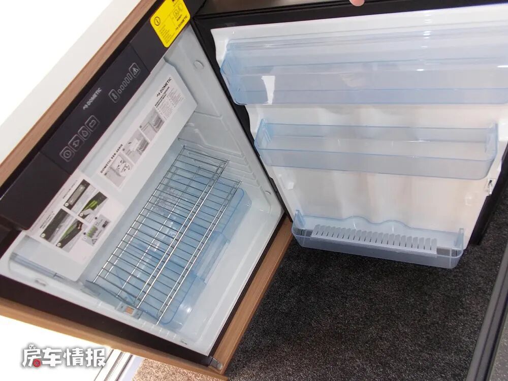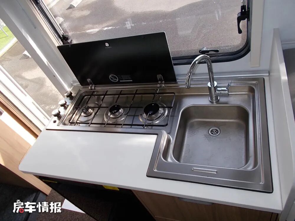 厨房区位于乘客门的后方,尺寸虽然不是很大,但是提供的配置还是挺齐全的,包括三孔的燃气灶、不锈钢水槽、车载冰箱和储物空间等,也能够满足日常的烹饪需求。
