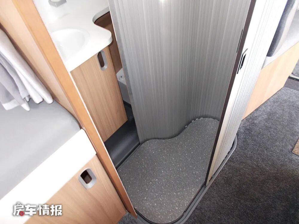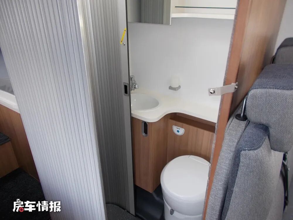 与之相对的,位于双人座椅后方的是全车的独立卫浴室,整体采用卷帘门式的设计,内部提供了马桶、洗手台盆、镜面的储物柜、淋浴花洒等,日常的基础洗漱和如厕需求还是可以满足的。