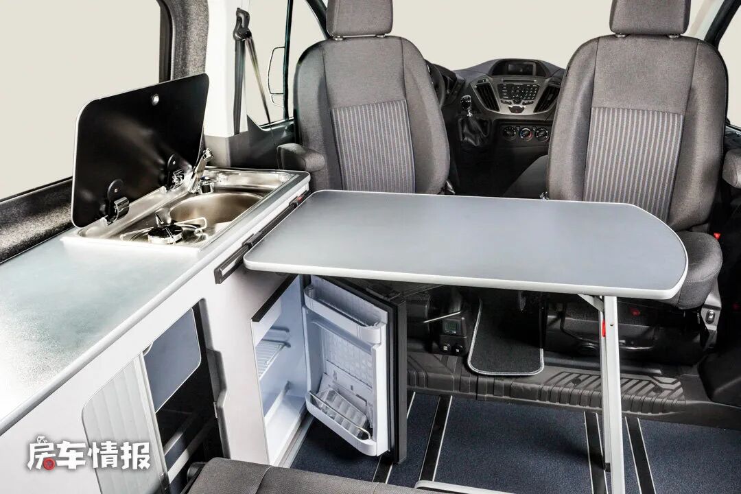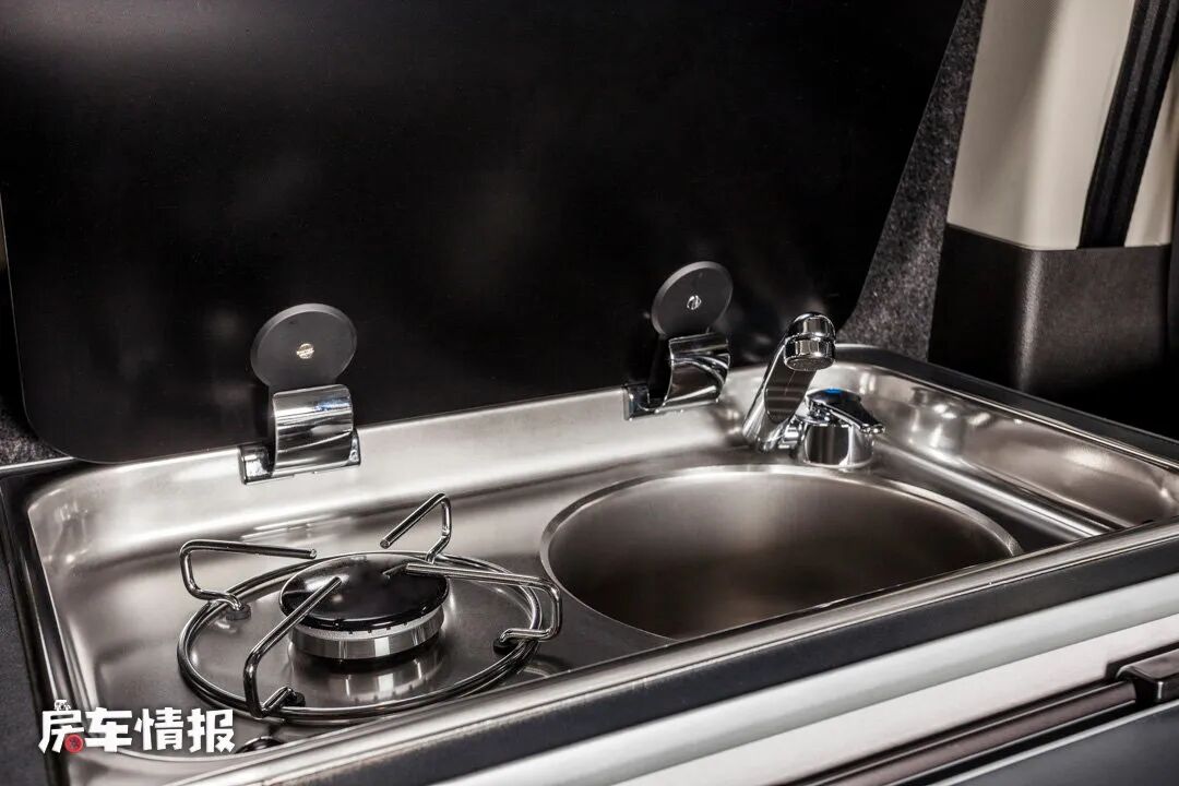 另外一种布局,虽然同样是三人乘客座椅,但在宽度上明显变窄了,因为整体在内侧主驾驶座椅后方加入了一个贯通式的操作台,最前方是提供了燃气灶、水槽和一台41L的车载冰箱的厨房区,后方则是设计成了车内主要的储物空间,可以存放一些日常物品。
