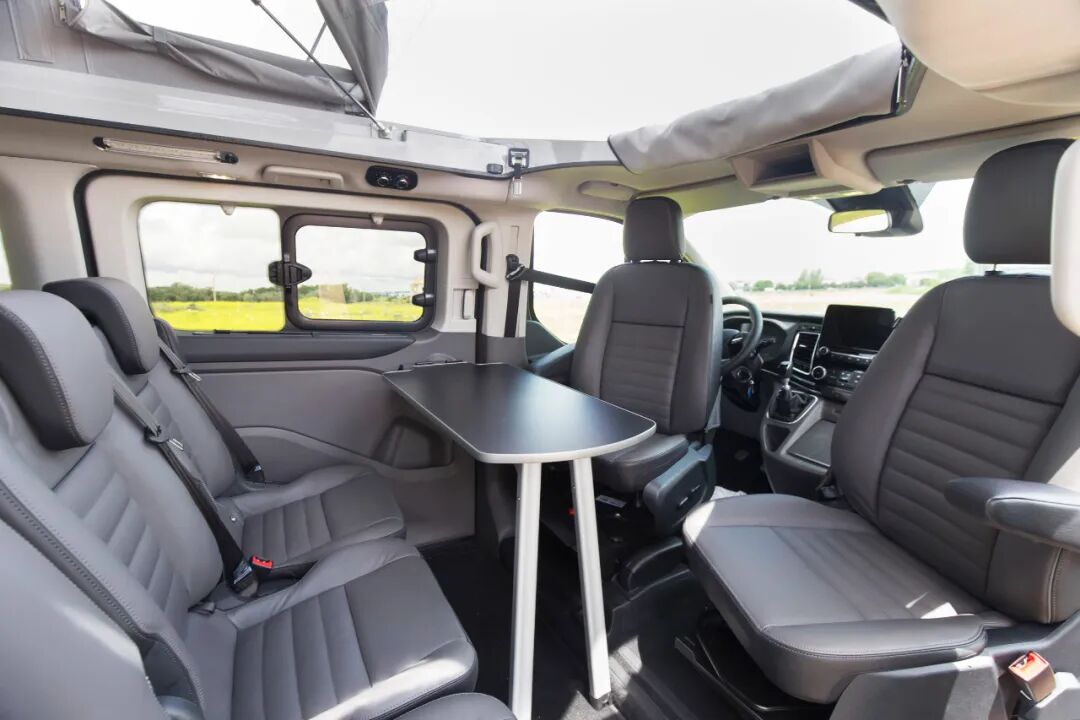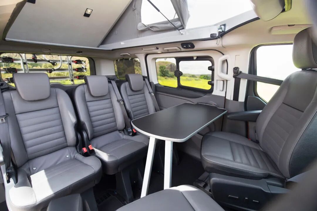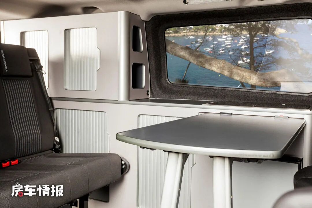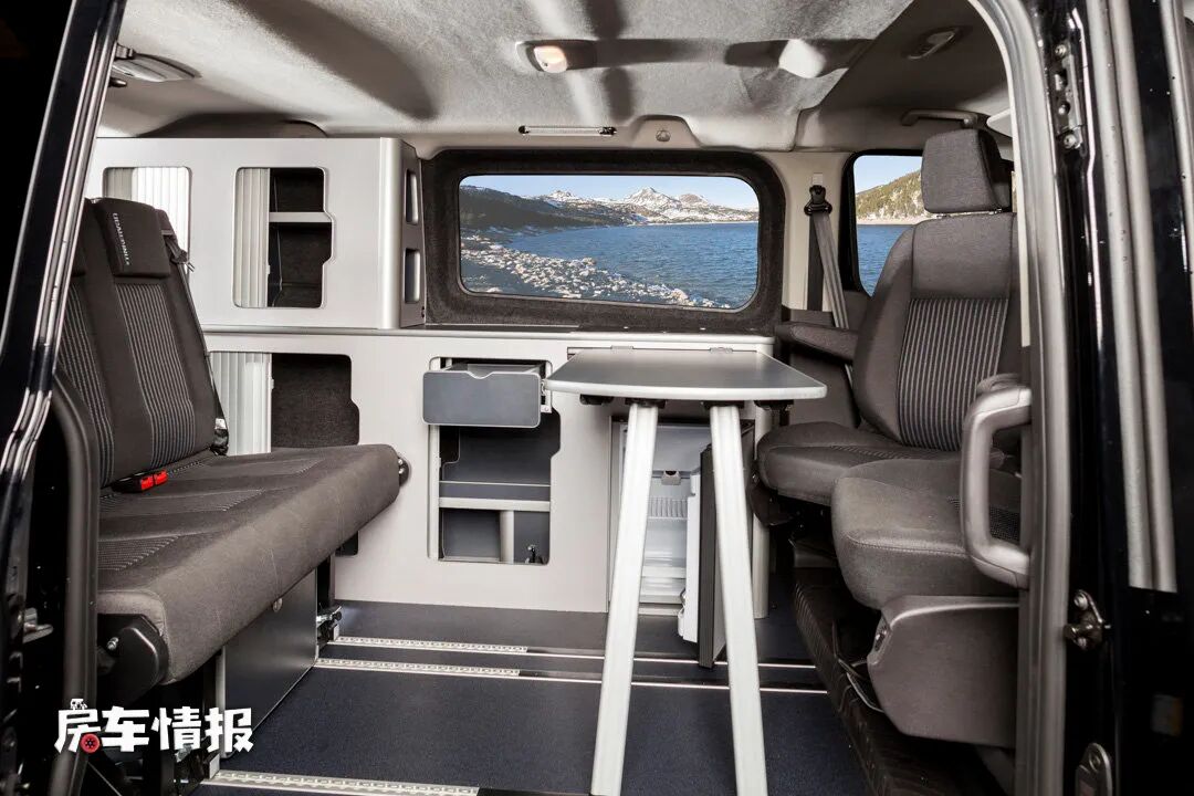 车内的布局不是一成不变的,可以根据自身的需求后期改装,一种布局是车厢内部第二排乘客座椅为三人的,搭配可以向后旋转的主副驾驶座椅和餐桌,可以打造出一个简单的五人就餐区域。