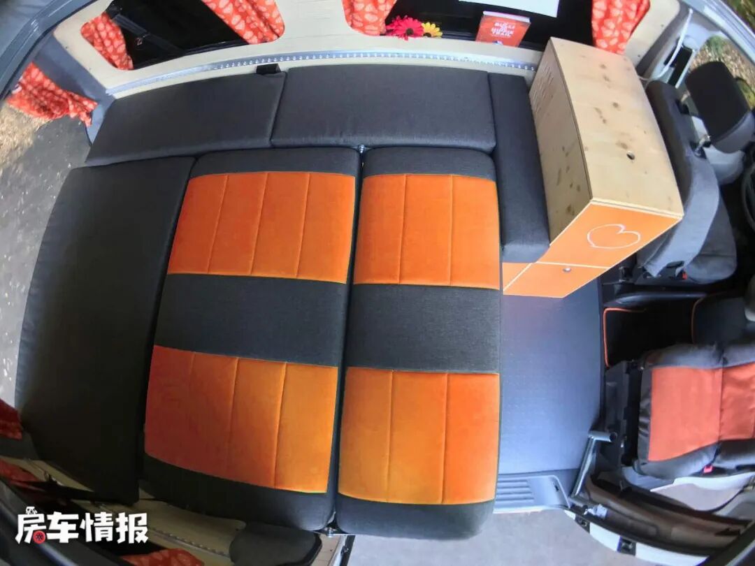 夜晚休息的时候,可以将车内座椅拼成一张双人床,睡下两名成年人没有问题;当然,露营车怎么会就一张床,将车顶弹出,内部还有另外一张双人床,这款车也是可以睡下一家四口人的。