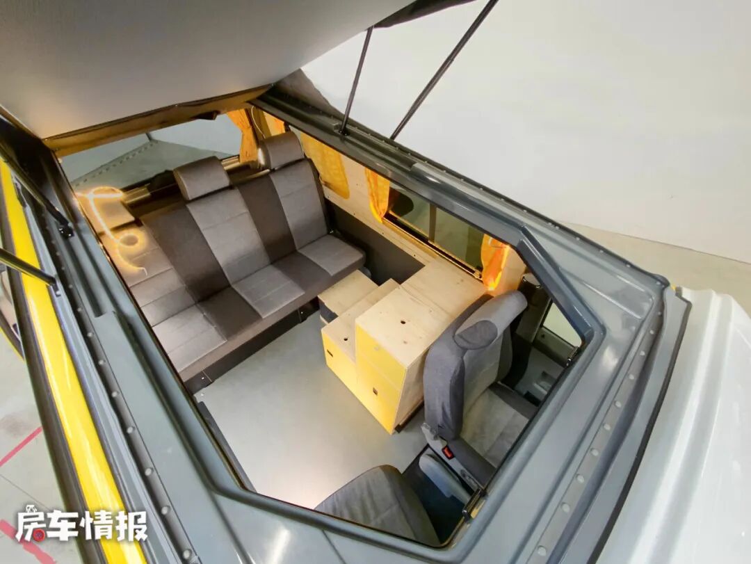 至于车内生活区的设计,相对来说就要常规一些,内部为常规状态下是5座设计,驻车以后可以将主副座椅旋转,变成小客厅,位于内侧提供了一个简单的多功能柜。