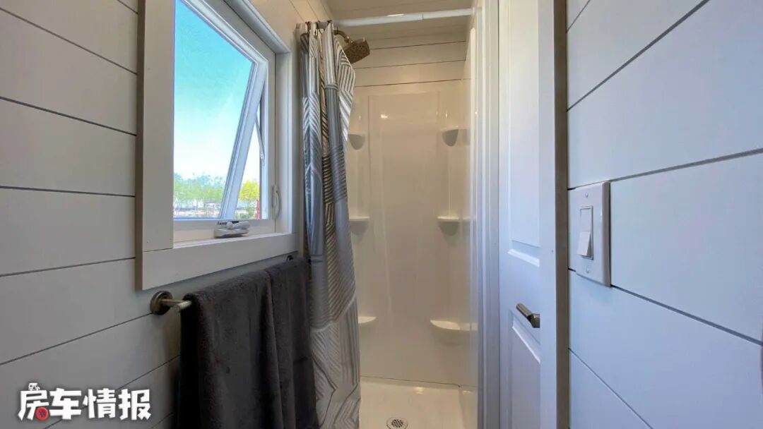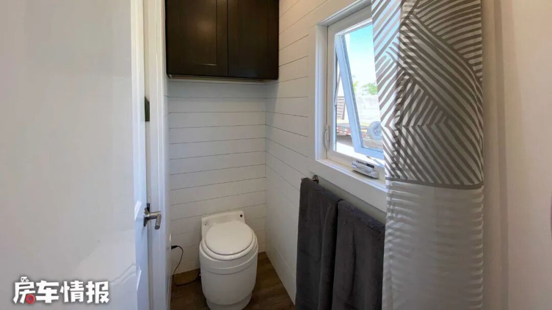 位于车尾部,是一个横向布置的干湿分离卫生间,内侧为独立的淋浴房,外侧是独立的直排马桶,不得不说老外这种横置布局的卫生间空间真心挺大,在不考虑储物的前提下,如此布置的卫生间日常使用非常方便。