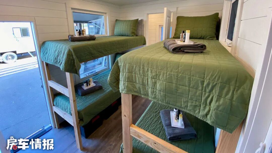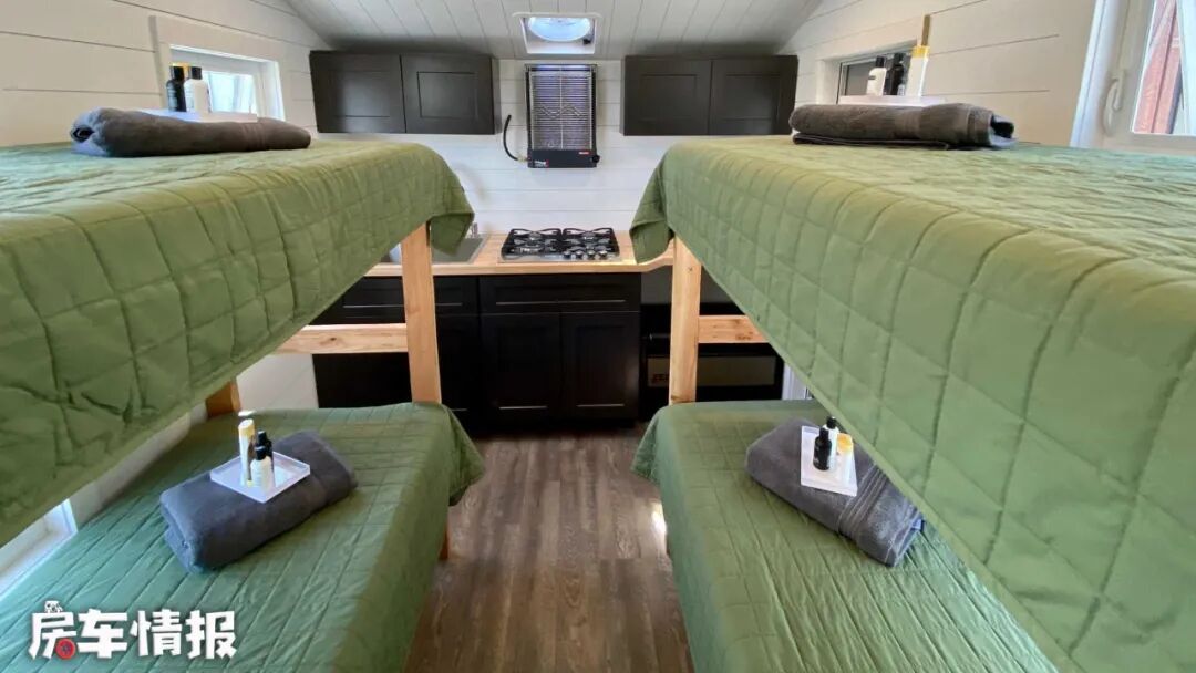 如果说外观看起来就是一个可以移动的小木屋,那么进入车内绝对会让你回到校园时光!车内方正的空间和普通家里的房间区别不大,内部最引人注意的就是左右两组上下床,实木的床架搭配高弹床垫,看起来有种宿舍的感觉,既温馨又令人怀念~