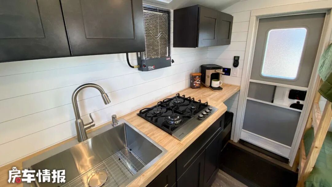 位于车厢前部,则设置一组大尺寸的厨房设备,四芯燃气灶、大尺寸洗菜池、组合储物柜等,让这里看起来和家里的厨房没啥区别,日常做饭、洗菜都能施展的开,需要注意是,做饭的时候不要影响“舍友”的休息。
