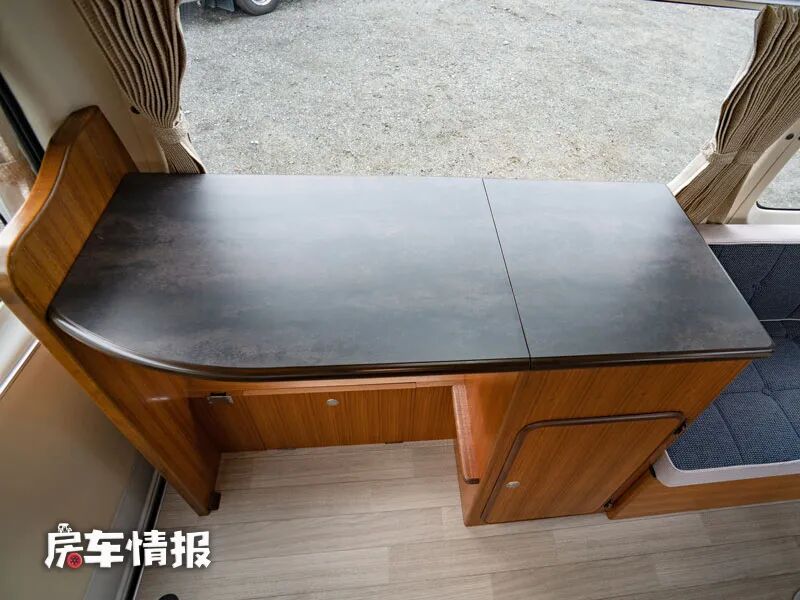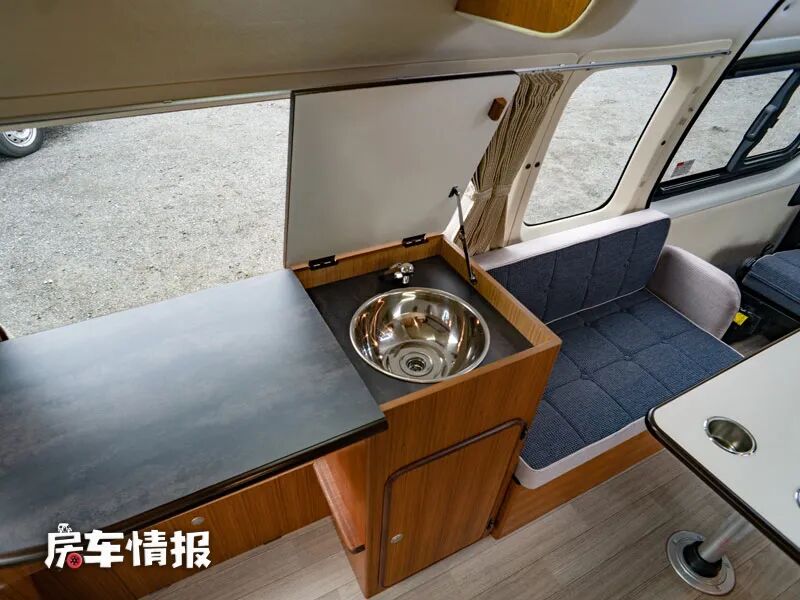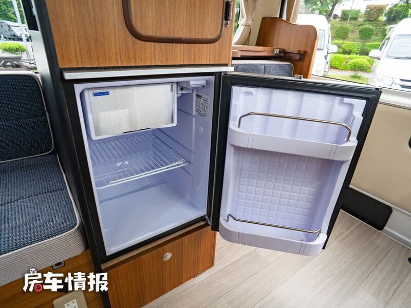 车厢尾部则是整辆车的厨房区域,一侧是提供了一台49L的车载冰箱,能够存放一些简单的食材。