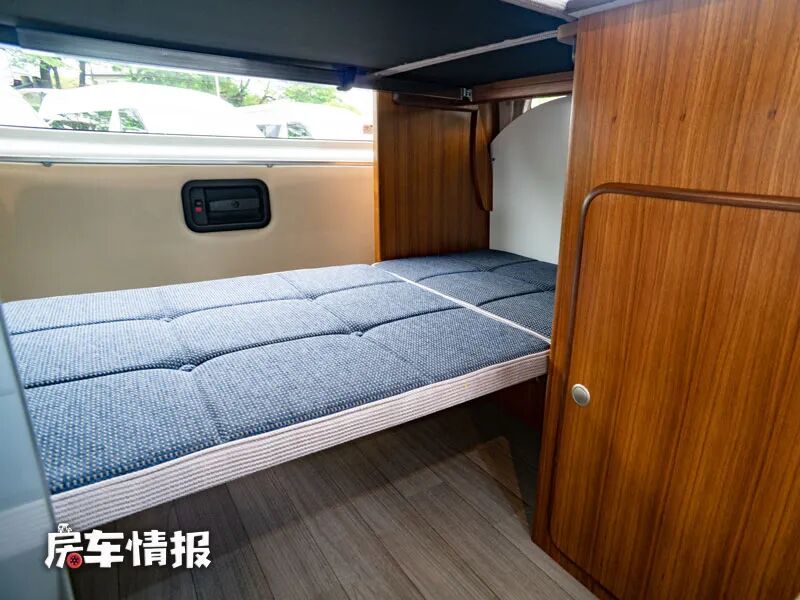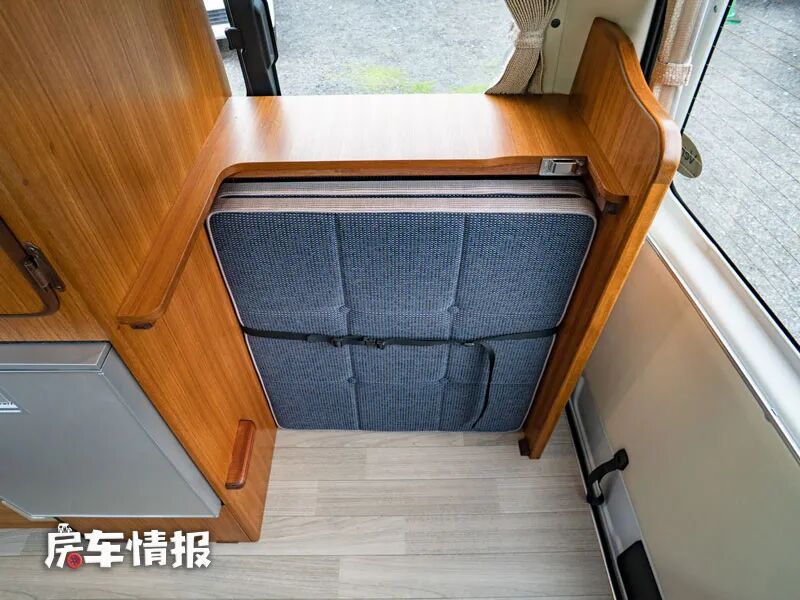 另外一侧则是放置床垫的储物空间,平时不使用时有安全带进行捆绑保护,也不会散落,当晚上需要睡觉休息的时候,则可以取出来搭建出一个上下的单人床,也能容纳两个小朋友使用。