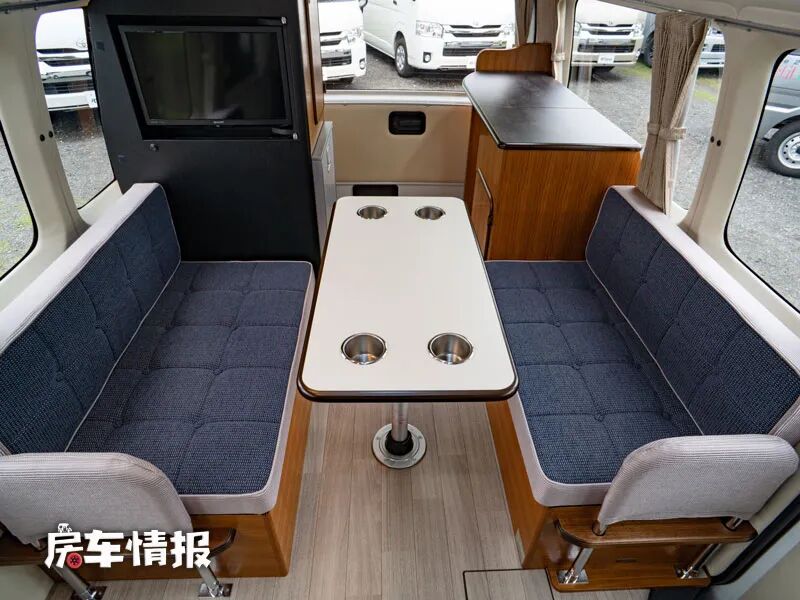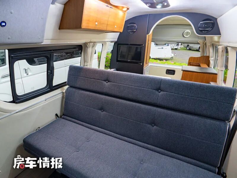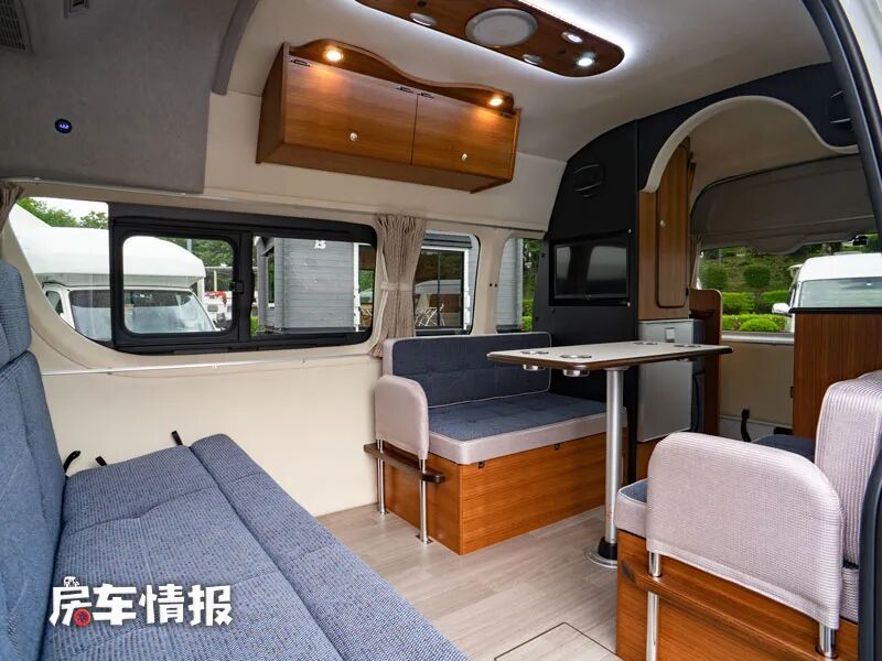 车厢内带有一排乘客座椅,日常行车乘坐时向前,当驻车准备就餐时,则可以翻折向后,与后方的对卡座沙发形成一个环形围绕式的大尺寸会客就餐区域,中间还提供了一张尺寸很大的餐桌,最多可以同时坐7个人,足以满足日常的需求。
