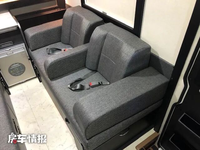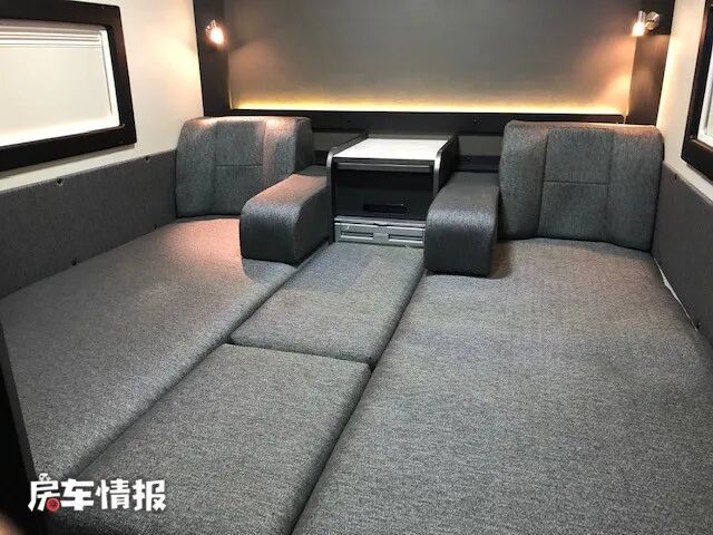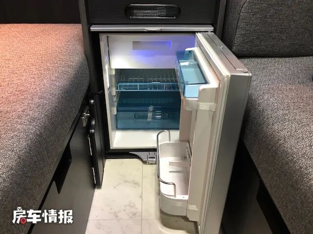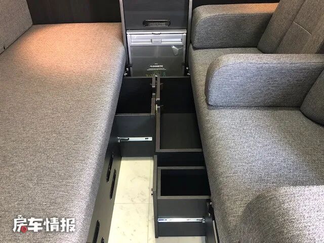 两个沙发中间的桌子里面还有个45L的房车冰箱,可以放置食物或饮料,在会客区可以聊天畅饮。