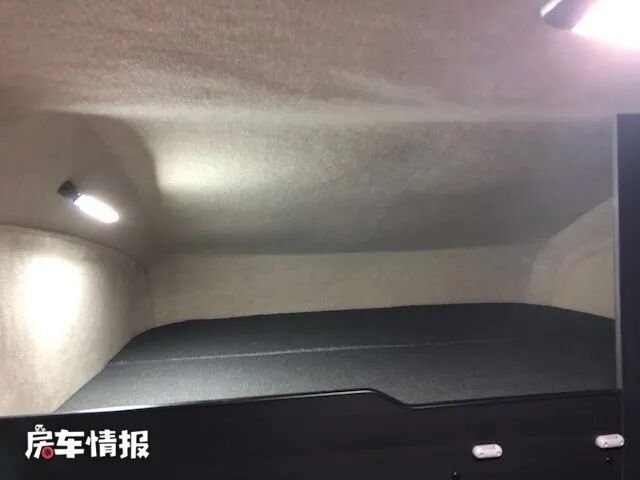 驾驶室上方的额头床尺寸约为1950*1500mm,睡下两名成年人不是问题,但是内部没有侧面的小窗户和天窗,只是安装了小的阅读灯来提供照明,所以这里仍显得有些阴暗,不过作为人多时的休息区域还是可以的。