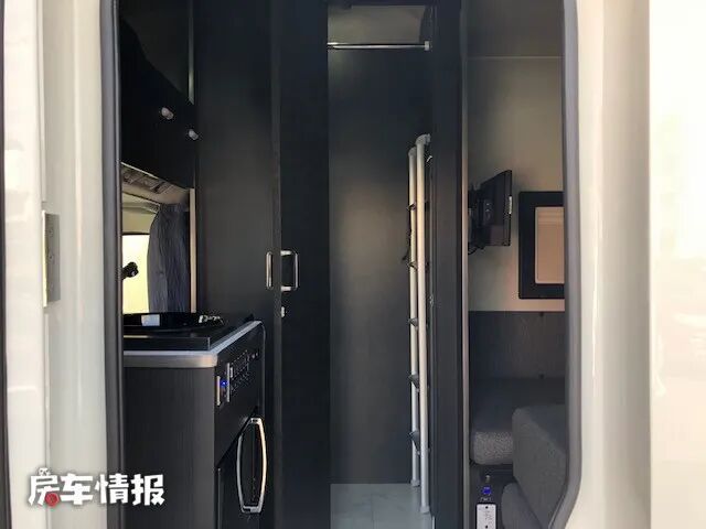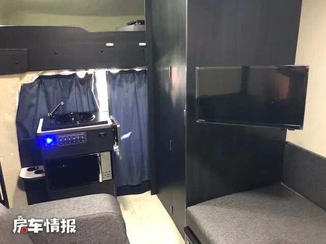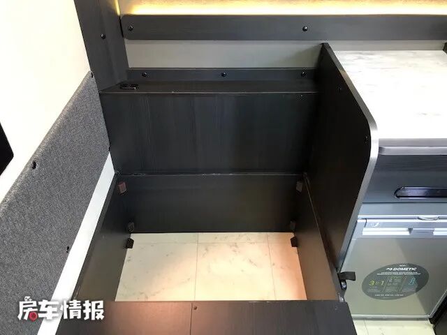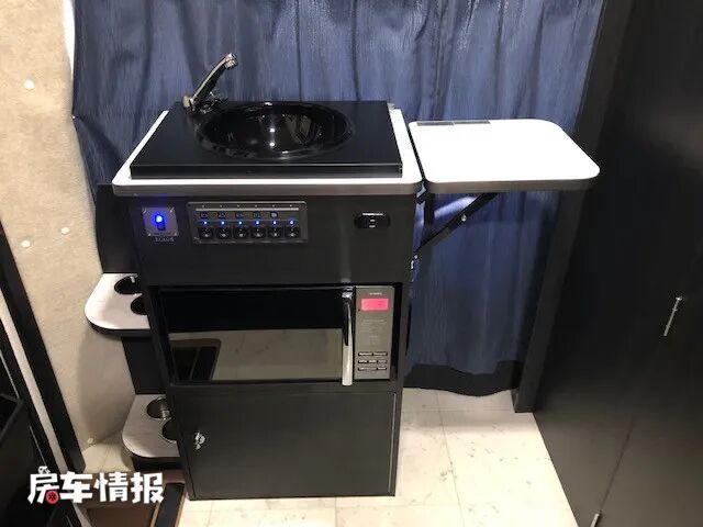 厨房区在车门左侧,只有一个小的组合柜,装有洗手池、水龙头、可折叠桌板以及柜子中间的微波炉,只是缺少了一个燃气灶,不过可以携带一个便携式卡炉,将食物洗净切好后在车外烹饪,这样能避免油烟污染车内的环境。同时车内的电气控制开关也在厨房的组合柜上,方便进行控制。