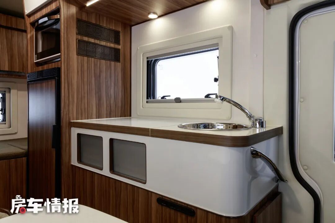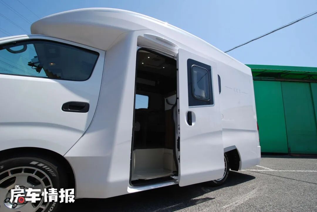 车厢侧门的设计也挺有意思,并没有使用常见的欧式或美式房车专用车门,而是采用了一扇侧滑门,就和常见的MPV车型上的一样,只不过这里的尺寸更小,日常滑动的时候会更轻便。