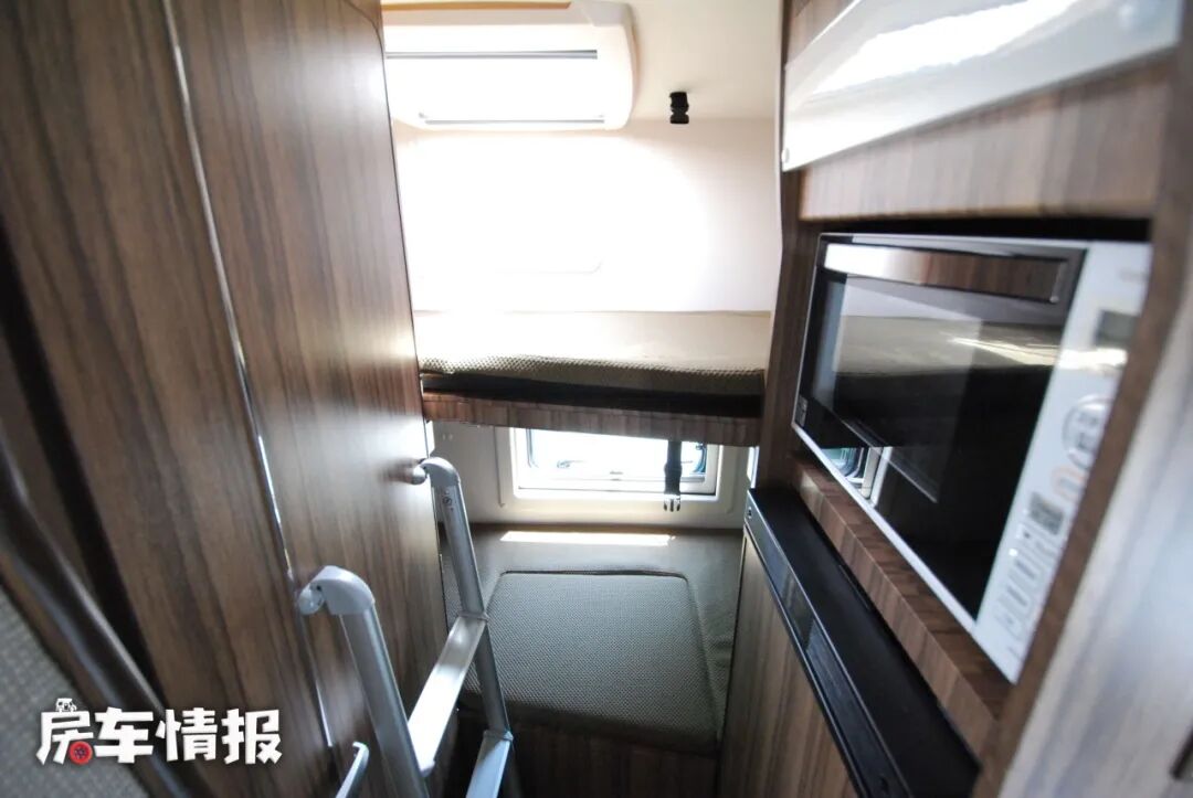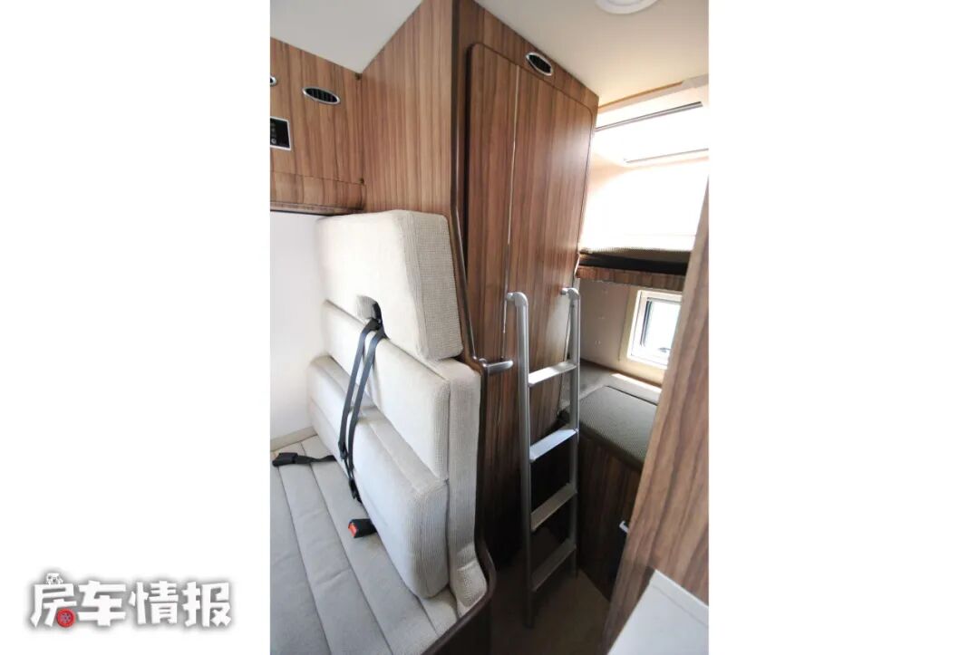 除此以外,位于车厢尾部,还提供了一组横置上下双层单人床,也可以睡下两名成年人,如此一来这款长度不到5米的房车,内部可以满足一家四口人住宿。