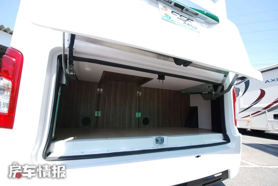 车身外部的设计也挺有看点,车身尾部提供了大尺寸的储物箱,可以把旅行中的大件行李存放进去,开口也挺大,拿取行李的时候都比较方便,而舱门的开启方式也比较有趣,采用的这种上掀式的尾门,打开以后可以自己固定住,既有格调实用性又高。