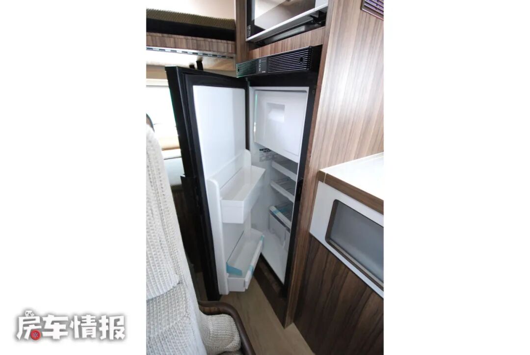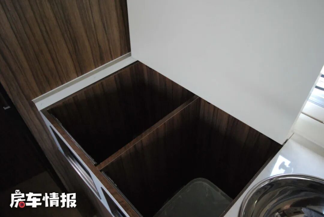 位于车厢左侧,是车内厨房所在的区域,提供了洗菜池、房车专用冰箱等基础设备,位于厨房操作台下方还隐藏着两个空间挺大的储物空间,可以放下一些相对比较大的物品。