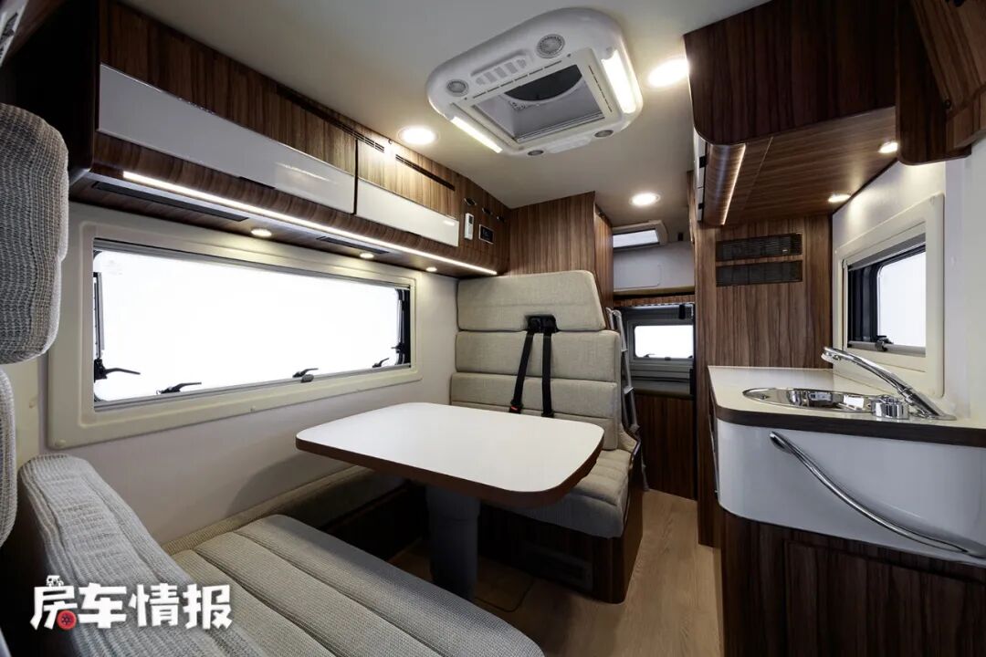 进入车厢内部,C型房车的优势就显现出来了,和以往常见的NV350打造的B型房车相比,内部空间有着质的改变,是标准的房车布局样式,前方的会客区采用四人对卡座设计,搭配驾驶室1+2的座椅布局,整车荷载7人。