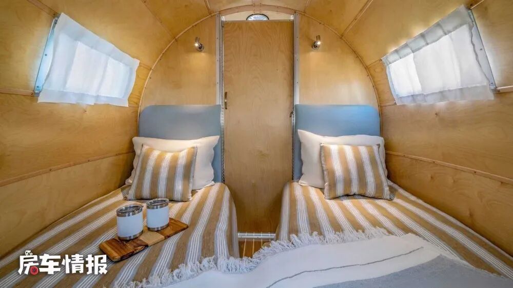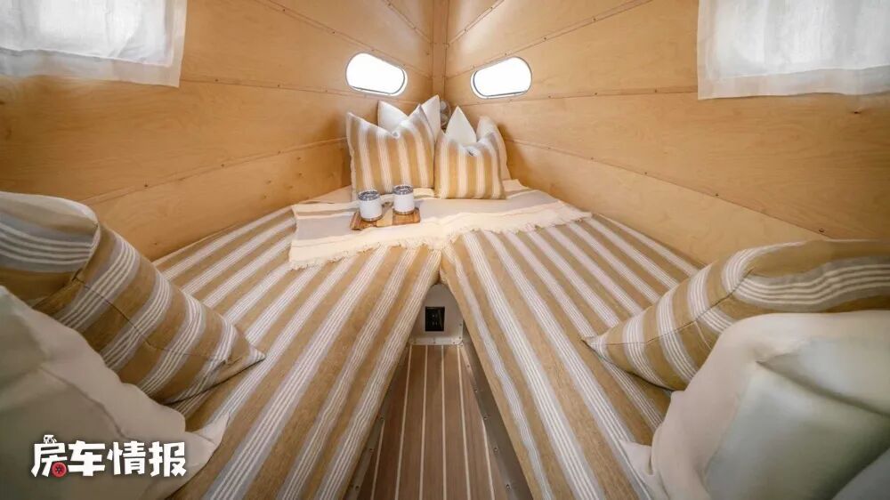 最后位于车厢最前方的休息区,因为外观的尖头设计,所以内部的两张单人床是以V字形摆放的,有需求的时候也可以合成一张双人床,空间还是不错的。