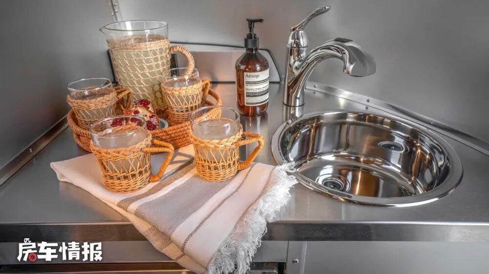 整辆车的外观不仅科幻酷炫,进入车厢内部会发现,装修的也很梦幻,有一种进入私人飞机的体验。全车采用了后上门的设计,在刚进门的区域是厨房区域,配备也相当丰富和齐全,包括双眼燃气灶、洗菜池、台面、储物柜、冰箱、纸巾架和微波炉在内的烹饪设施,可以说配套设施是非常的齐全。
