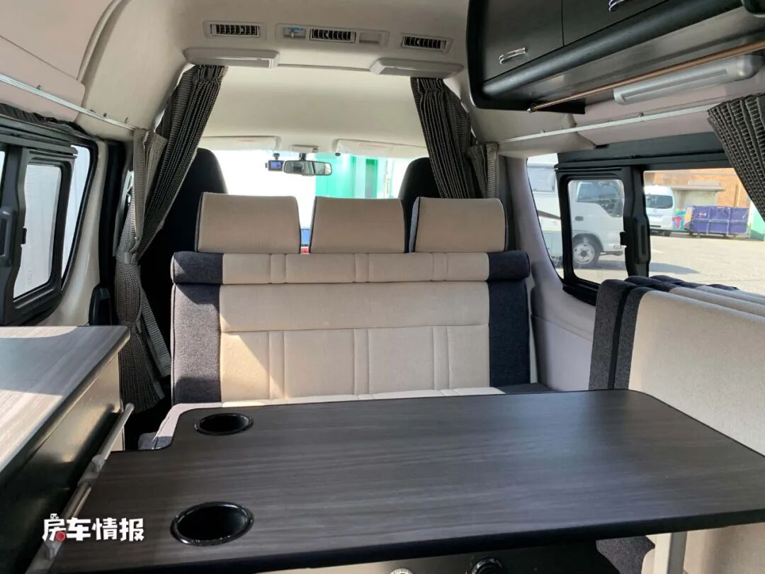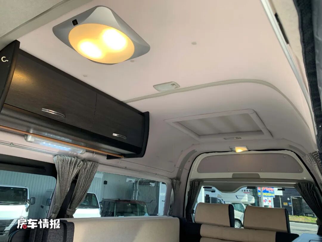 顶部的天花板上除去带有基础的照明灯之外,后方还有一扇带有遮挡帘的天窗,白天的时候可以打开为车内增加一定的采光,晚上则可以关闭遮挡帘保证车内的隐私。