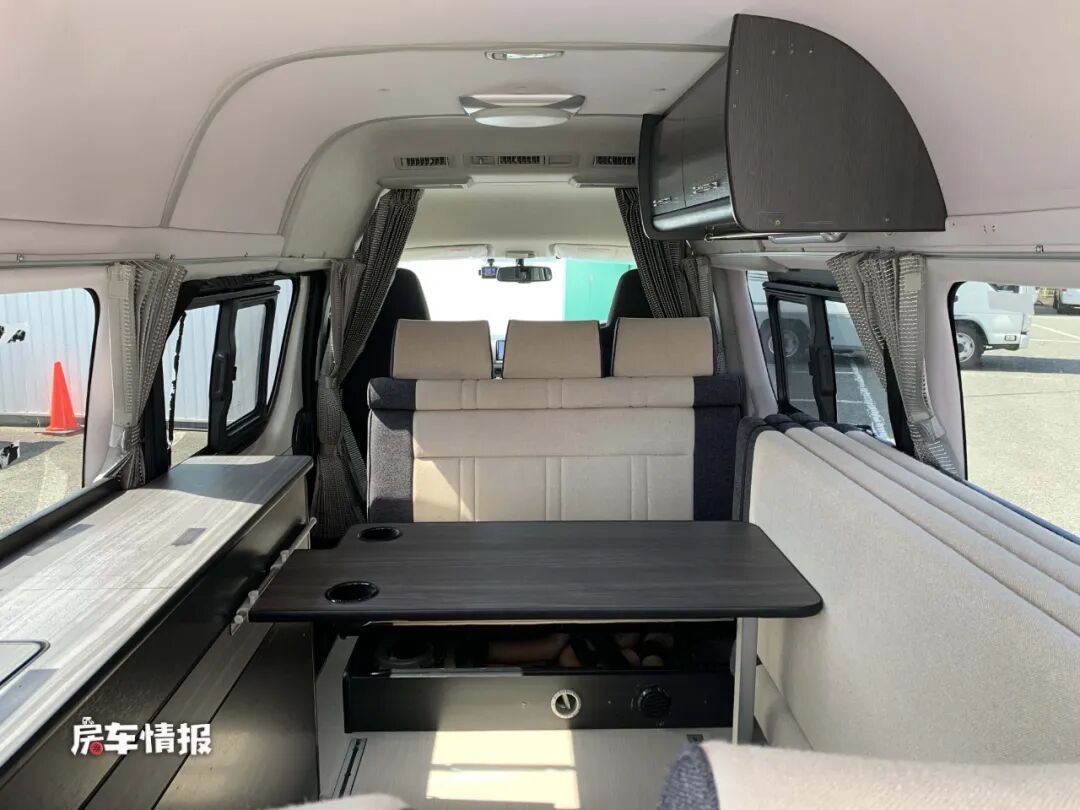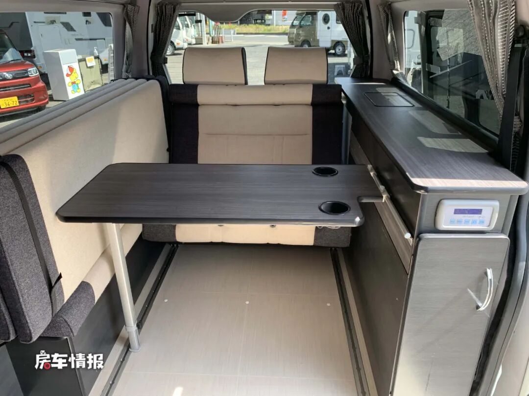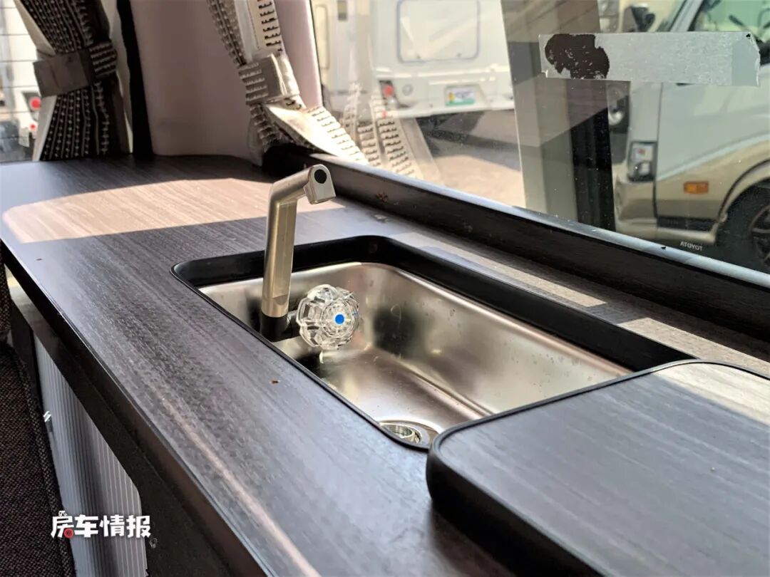靠近乘客门的地方,是一个尺寸还不错的厨房操作台,上方带有一个带盖的小型不锈钢水槽,也能进行简单的冲洗和洗漱,旁边可以放置一台便携式的电磁炉或者卡式炉,来完成基本的烹饪需求。