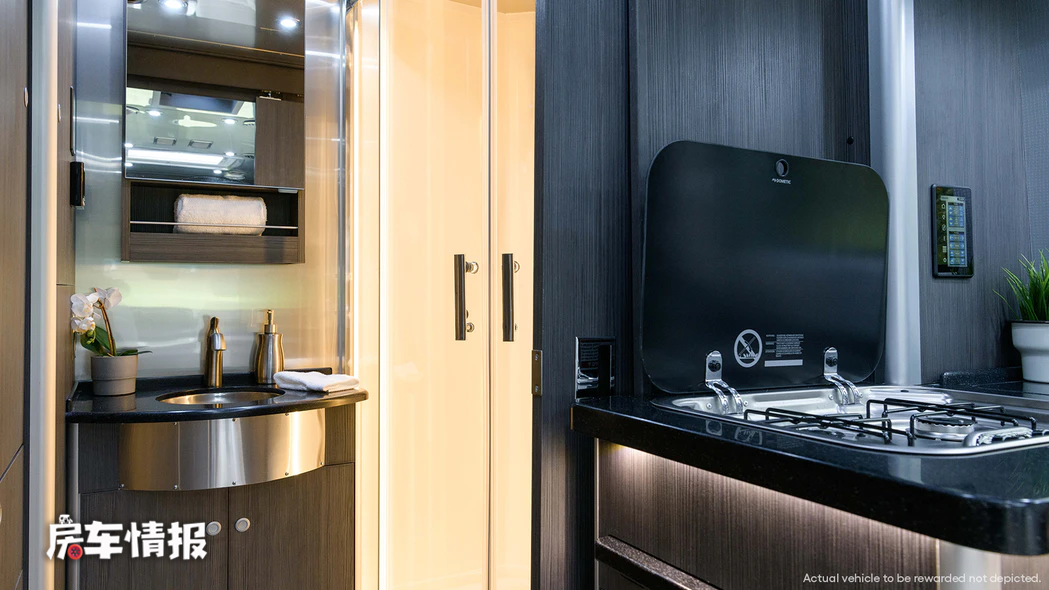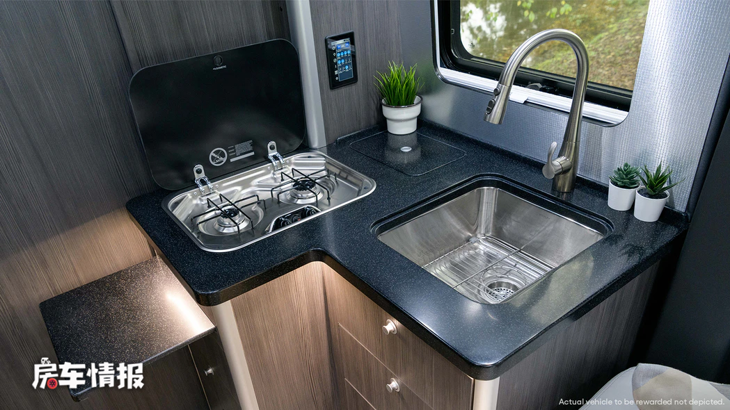 车厢尾部是厨卫所在的区域,厨房区域位于外侧,采用的是L形布局,这里提供双芯燃气灶以及一个尺寸超大的洗菜池,再加上车内的冰箱、微波炉、烤箱等设施,能够满足日常使用需求。
