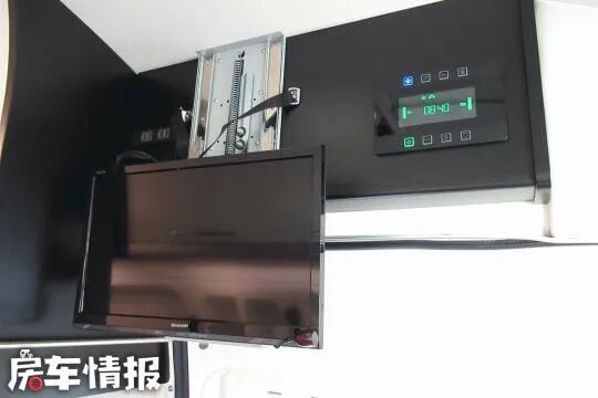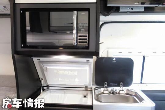 乘客门后方是全车的厨房操作台,提供的配置还是比较齐全的,包括翻盖的不锈钢水槽、车载冰箱、微波炉、抽油烟机和卡式炉等,能够满足日常的基础烹饪需求。